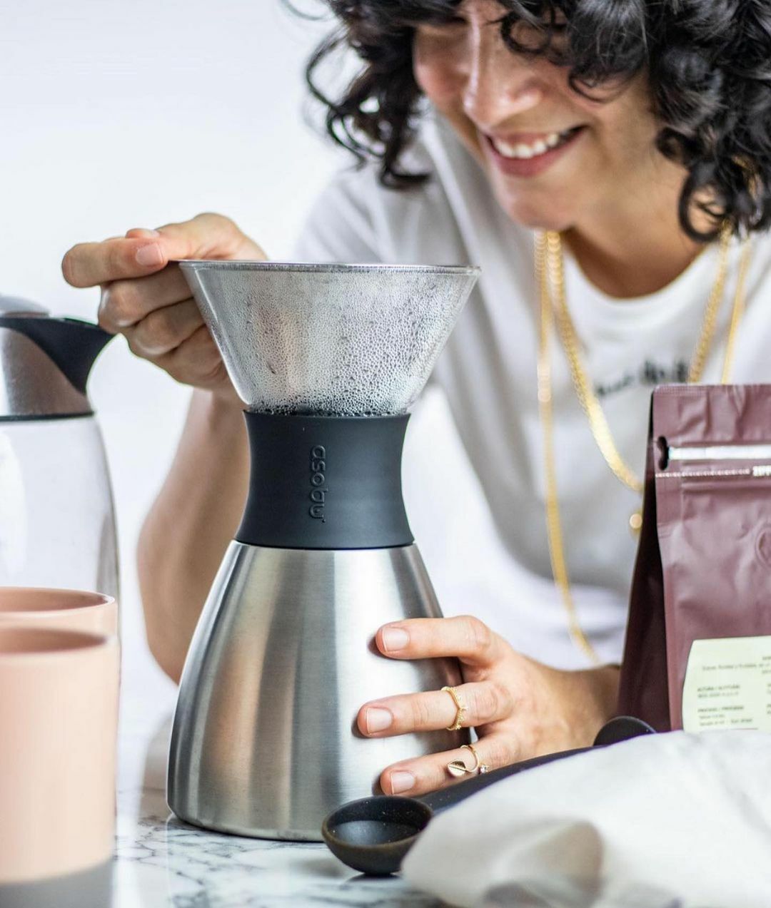 Кофеварка «Pour Over» от Asobu позволяет приготовить кофе, не привлекая никаких дополнительных приспособлений: просто засыпьте кофе в фильтр, вставленный в стеклянную воронку, и залейте кипятком. Вам даже не понадобится бумажный одноразовый фильтр, ведь в комплекте к «Pour Over» идет многоразовый, из нержавеющей стали, за которым очень просто ухаживать: просто промойте его под струей воды до и после использования.