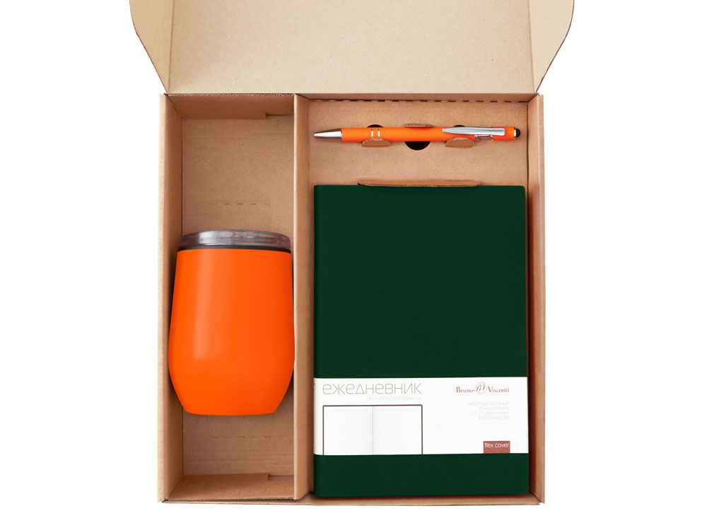 ежедневник - искусственная кожа, термокружка - нержавеющая сталь снаружи, полипропилен внутри, ручка - металл c покрытием soft-touch, ситечко - нержавеющая cталь