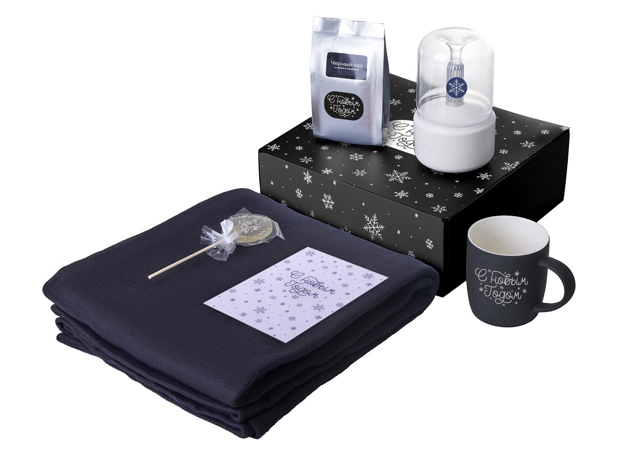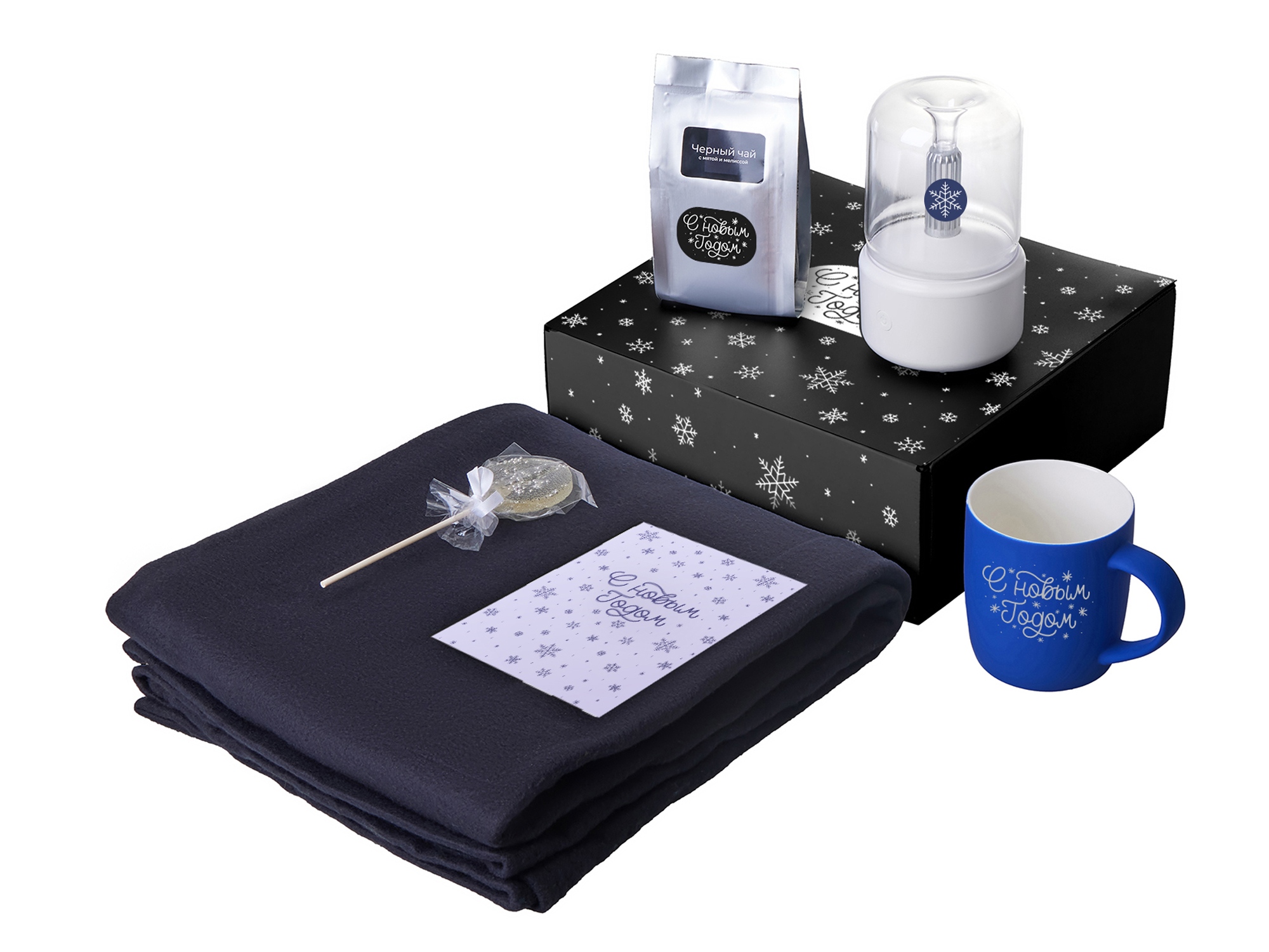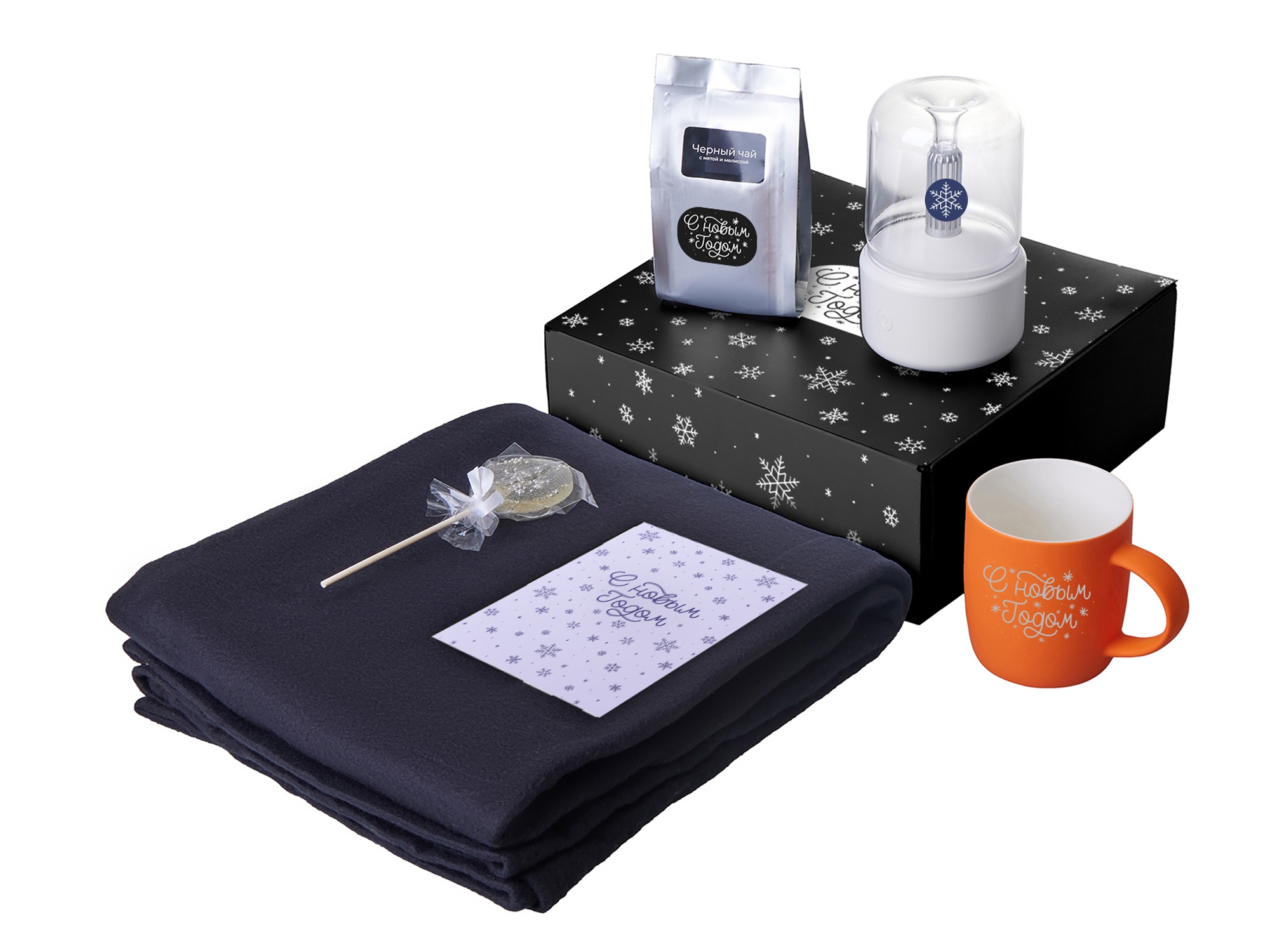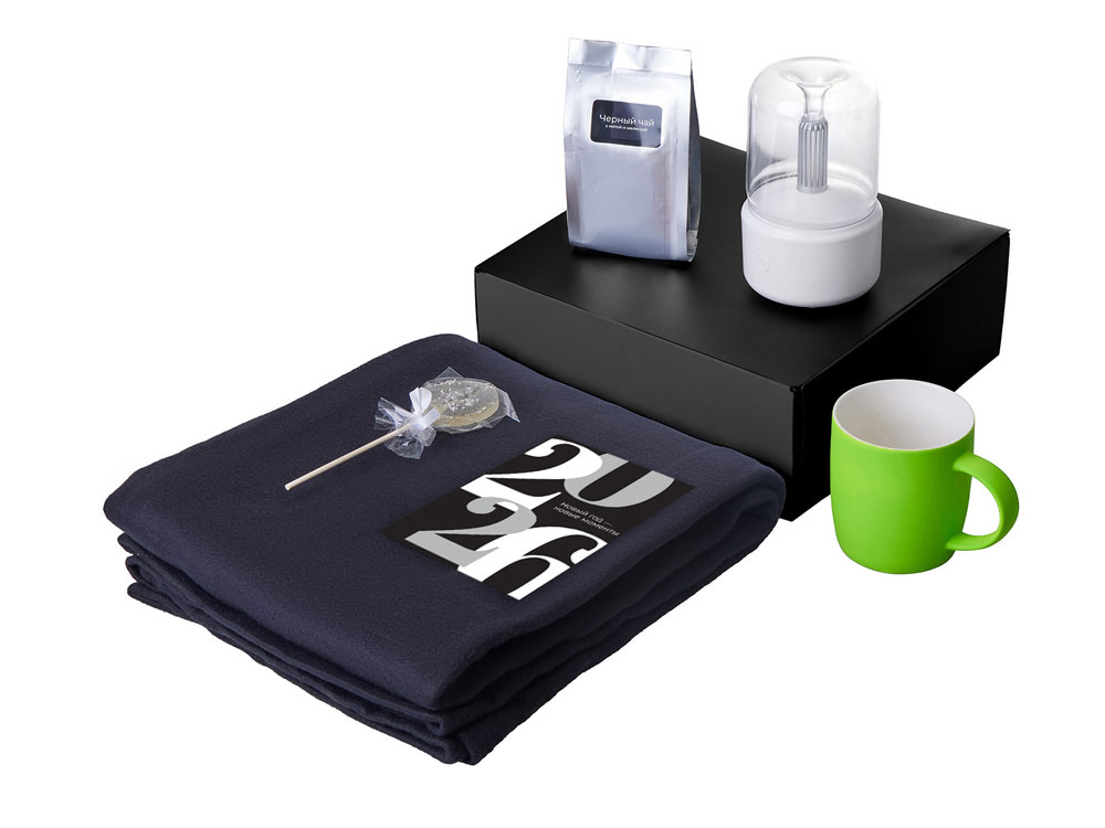 плед - флис 100% полиэстер; увлажнитель-аромадиффузор - АБС пластик, поликарбонат; кружка - костяной фарфор с покрытием soft-touch; открытка - бумага; мешок - нетканый материал (спанбонд)